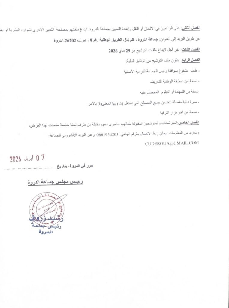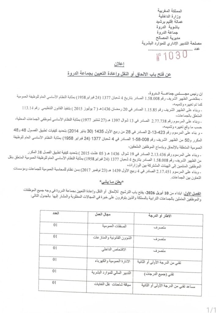 إعلان عن فتح باب الإلتحاق أو النقل وإعادة التعيين بجماعة الدروة